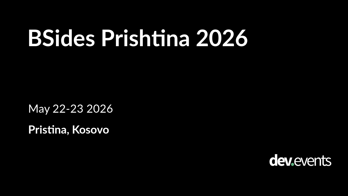 BSides Prishtina 2026 is happening on May 22, 2026 in Pristina, Kosovo. More information: https://dev.events/conferences/b-sides-prishtina-2026-xvbvpvsu