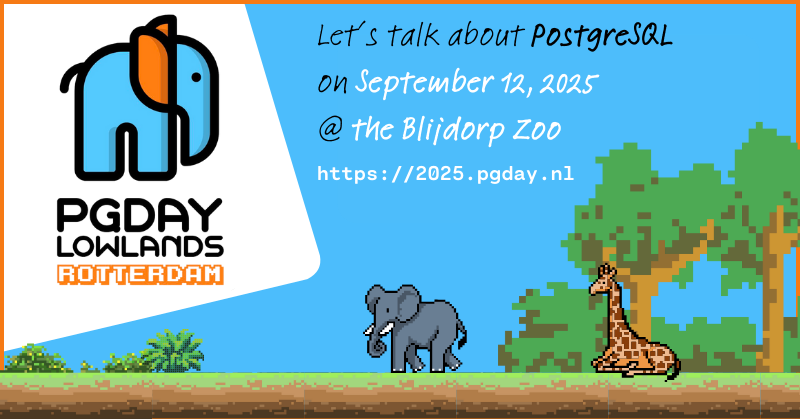 A 1-day PostgreSQL community conference in Rotterdam, Netherlands.