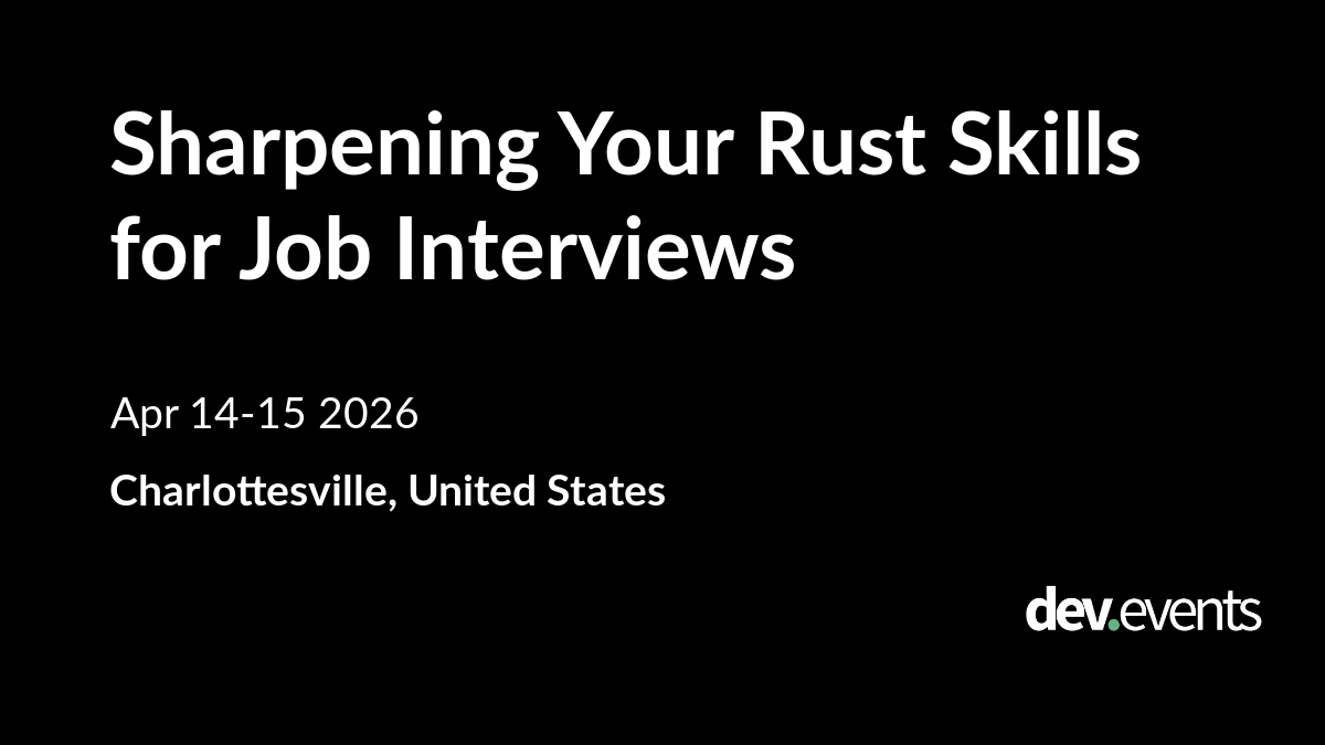 Sharpening Your Rust Skills for Job Interviews is happening on April 14, 2026 in Charlottesville, United States. More information: https://dev.events/conferences/sharpening-your-rust-skills-for-job-interviews-313262215