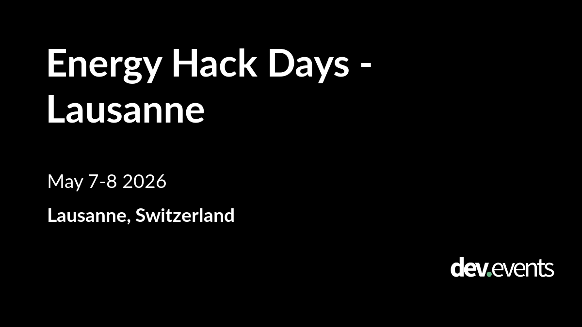 Energy Hack Days - Lausanne is happening on May 7, 2026 in Lausanne, Switzerland. More information: https://dev.events/conferences/energy-hack-days-lausanne-q5aaftn2