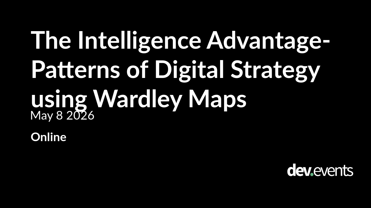 The Intelligence Advantage- Patterns of Digital Strategy using Wardley Maps is happening on May 8, 2026, Online. More information: https://dev.events/conferences/the-intelligence-advantage-patterns-of-digital-strategy-using-wardley-maps-312312610