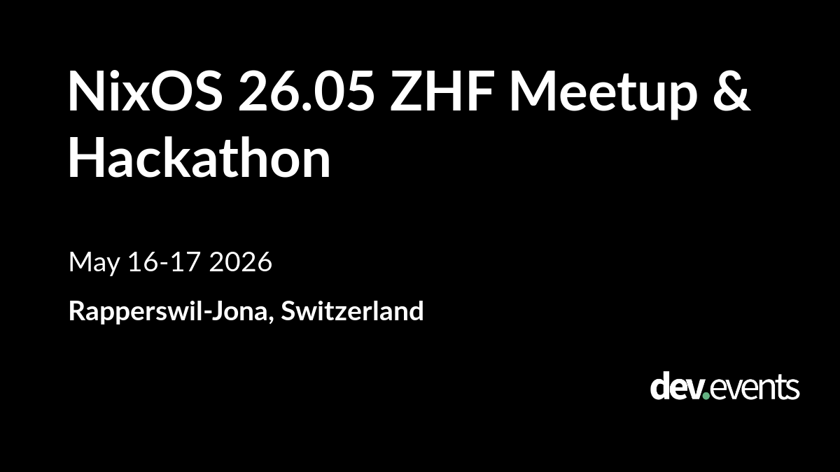 NixOS 26.05 ZHF Meetup & Hackathon is happening on May 16, 2026 in Rapperswil-Jona, Switzerland. More information: https://dev.events/conferences/nix-os-26-05-zhf-meetup-and-hackathon-313265662